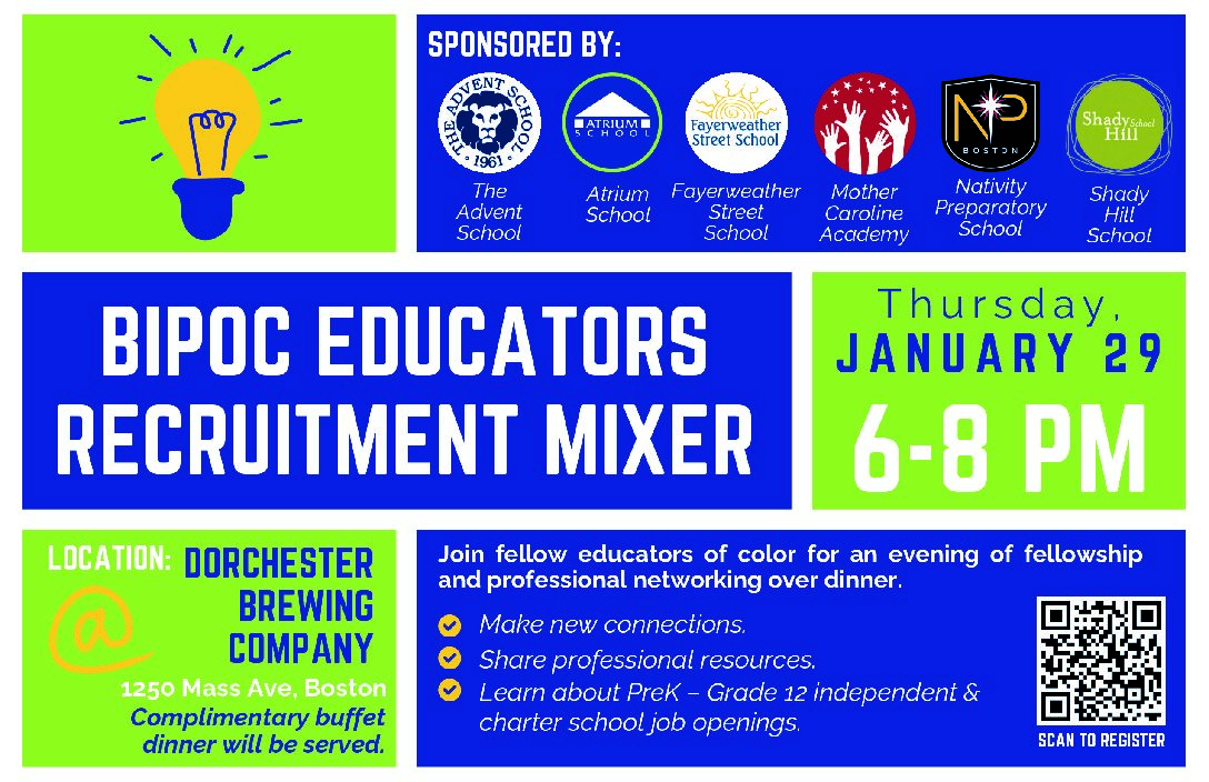 The BIPOC Educators Recruitment Mixer will be held at Dorchester Brewing Company. An evening of networking and fellowship over a complementary buffet dinner, this event is a great opportunity for BIPOC educators to connect, share resources, and support each other in the education field. We’ll also discuss current and prospective job openings at independent and charter schools. Come meet fellow PreK – Grade 12 professionals and build a strong community. This event is sponsored by The Advent School, Atrium School, Fayerweather Street School, Mother Caroline Academy, Nativity Preparatory School, and Shady Hill School. Register in advance at bit.ly/BERM-2026. We look forward to seeing you! This event is 21+.