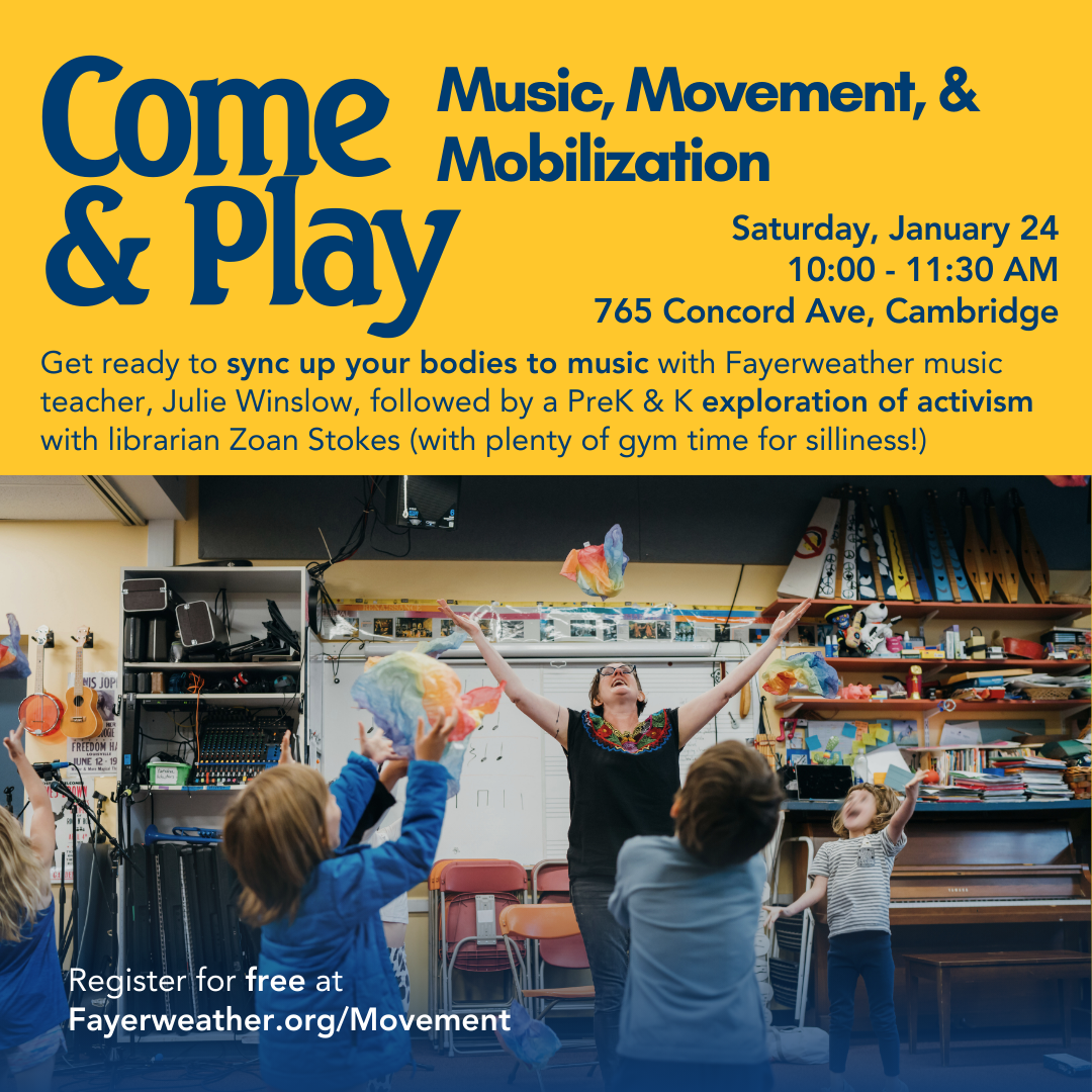Get ready to sync your bodies to music! First, we’re going to sing songs and move and groove with the renowned Julie Winslow! Then this rockin’ dance party will be followed by a chance to explore our PreK and K classrooms with our librarian Zoan Stokes as she marches us through change-making actions and activists.