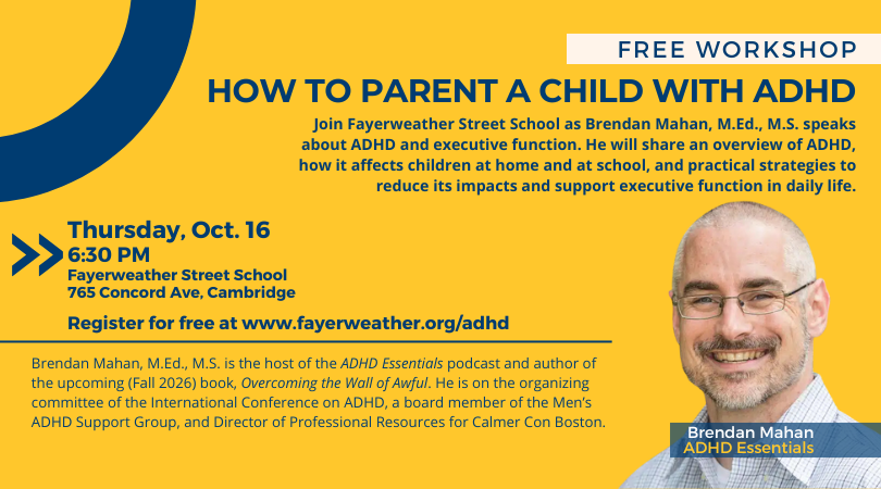 Brendan Mahan, M.Ed., M.S. will visit Fayerweather Street School on October 16 at 6:30pm to discuss ADHD & executive function.