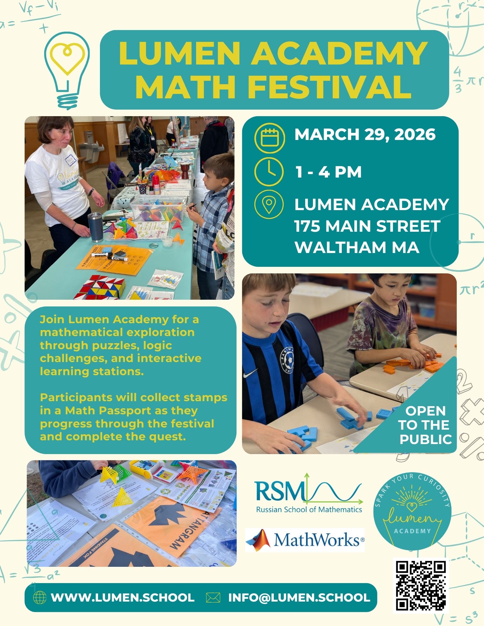 📐 Join Lumen Academy for a mathematical exploration through puzzles, logic challenges, and interactive learning stations. 🧩➕🔍