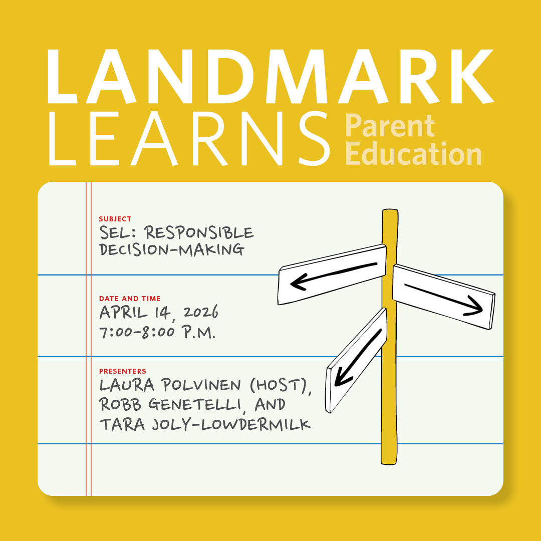 Join Landmark School experts for a dynamic discussion exploring the complexities of responsible decision-making for school-aged children, especially those who may struggle in school. Understanding how actions and words at school and at home can elicit negative consequences and impulse control in managing emotions are skills that, for many, take some honing. The session will also highlight the implications of peer pressure on healthy reasoning. Presenters will provide practical strategies for parents as well as educators.