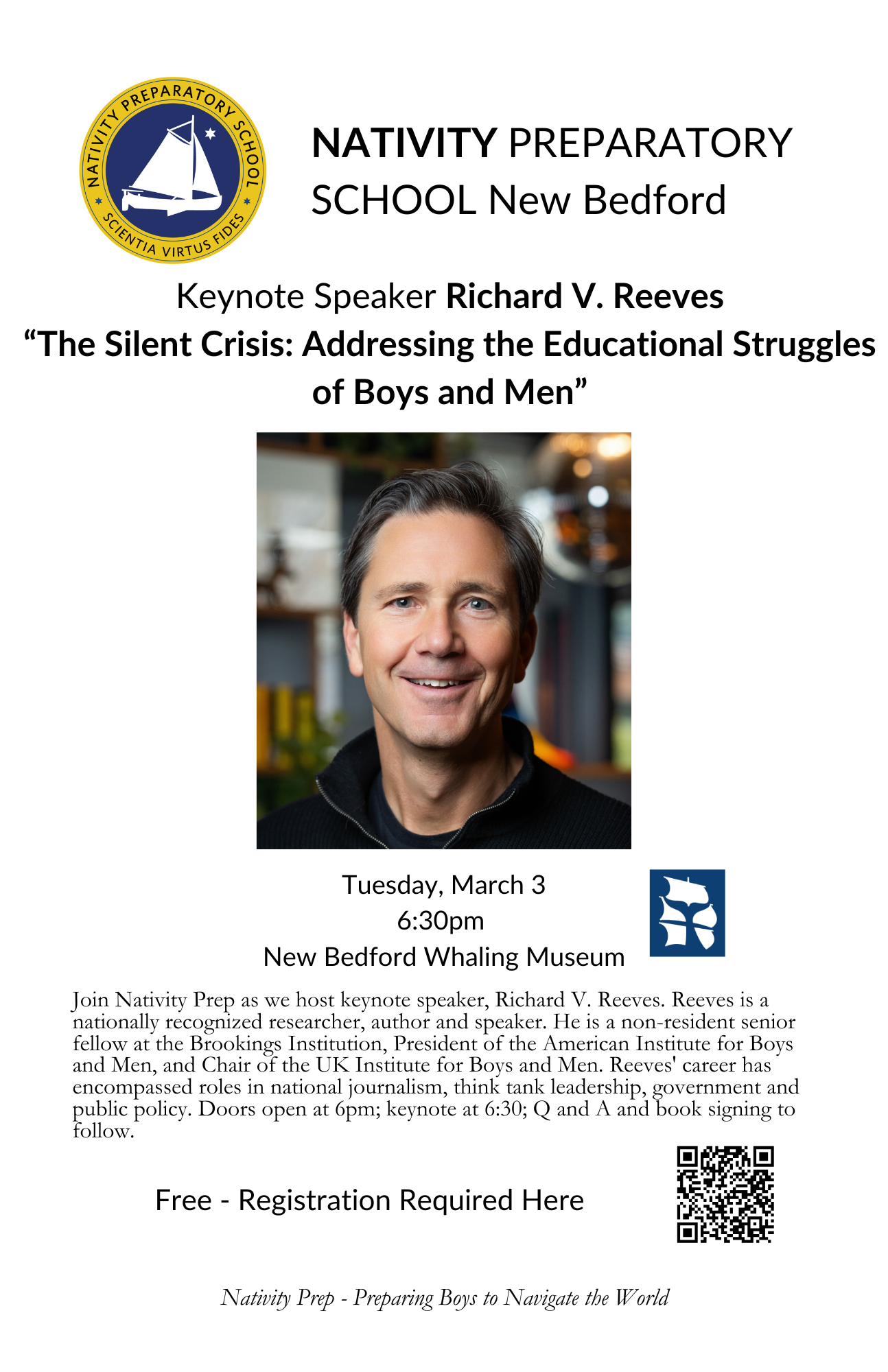 The Silent Crisis – Addressing the educational struggles of boys and men. Join Nativity Prep as we host keynote speaker, Richard V. Reeves. Reeves is a nationally recognized researcher, author and speaker. He is a non-resident senior fellow at the Brookings Institution, President of the American Institute for Boys and Men, and Chair of the UK Institute for Boys and Men.