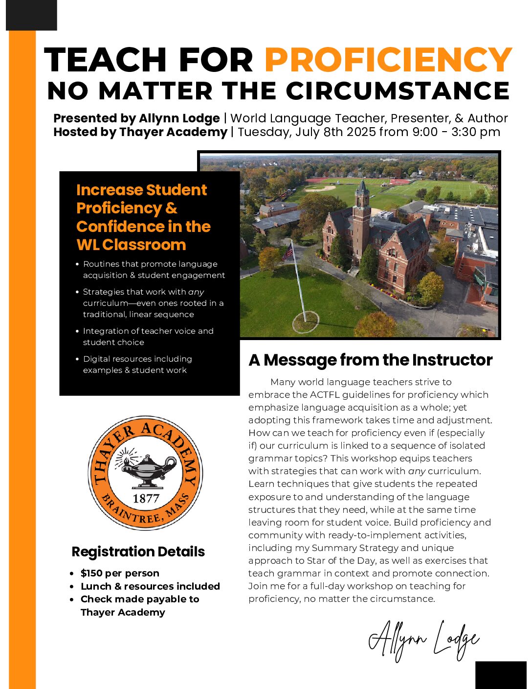 Many world language teachers strive to embrace the ACTFL guidelines for proficiency which emphasize language acquisition as a whole; yet adopting this framework takes time and adjustment. How can we teach for proficiency even if (especially if) our curriculum is linked to a sequence of isolated grammar topics? This workshop equips teachers with strategies that can work with any curriculum. Learn techniques that give students the repeated exposure to and understanding of the language structures that they need, while at the same time leaving room for student voice. Build proficiency and community with ready-to-implement activities, including my Summary Strategy and unique approach to Star of the Day, as well as exercises that teach grammar in context and promote connection. Join Allynn Lodge for a full-day workshop on teaching for proficiency, no matter the circumstance.